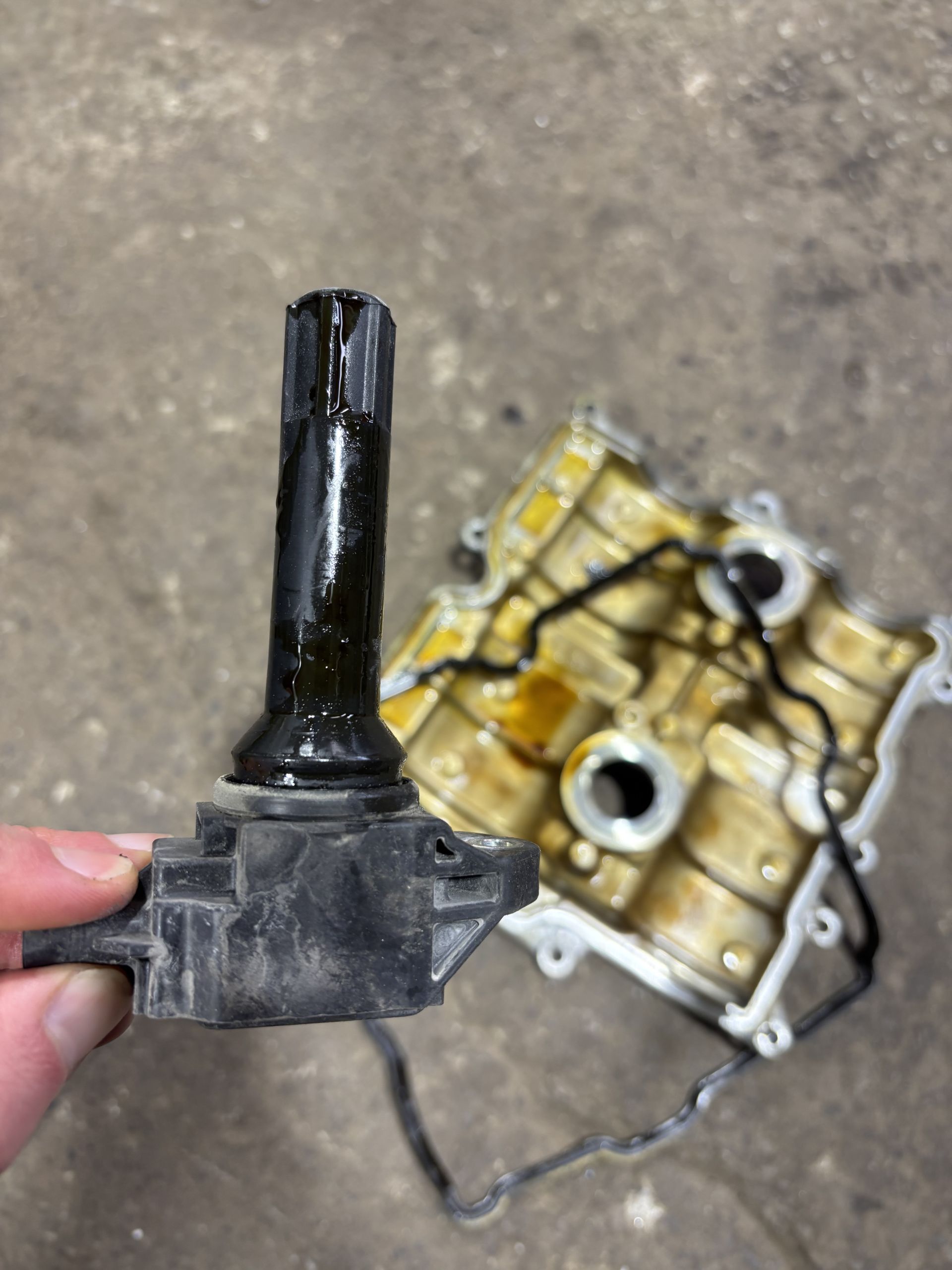 Spark plug replacement is recommended every 100k kilometres according to Subaru service. Even if the customer has had them replaced on a previous service, it is always good to check because as shown in the photo, you might find them covered in oil. The car in our example is a Subaru Crosstrek 2014.