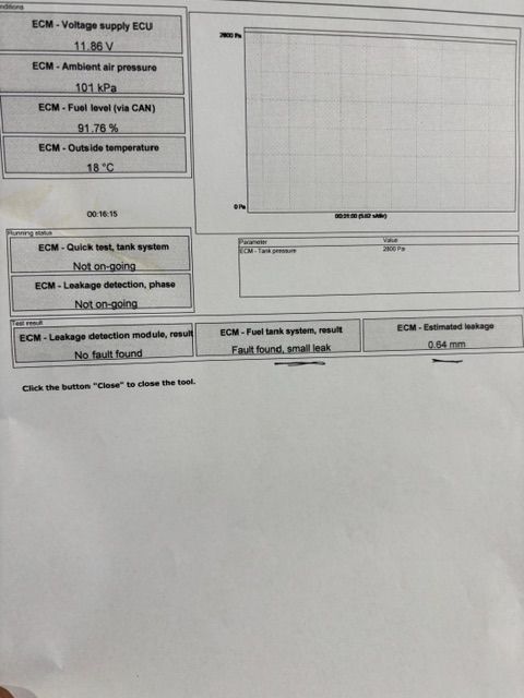 These pipe have been on back order for the last couple of years and sometimes takes months to receive them. We cleaned out the corroded part as best as possible, sealed it and let it cure. We retested the evaporation system and as seen on the photo the results showed no leaks (0mm). The code was erased and the car was delivered to the customer.