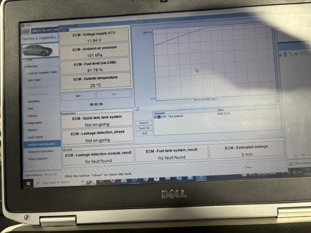 The check engine light is on. Customer comes in and we scan the car with VIDA (Volvo’s official diagnostic program). Code is ECMP044200 evaporation emission leak detected. Having seen and experienced this code multiple times over the years, especially on Volvo P3 S60/ V60’s we have a good idea what the problem is. Still, we have to go through the diagnostic steps. First, we run an evaporation quick test on VIDA which pressurizes the system. As seen on the bottom right of the test results photo, the car detected a leak of approximately 0.64 mm. Now we know that the car has a problem. Next, we must smoke test the evaporation system in order to actually see where the leak is.